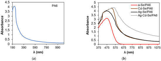 The absorption spectrum of PA 6 (Figure 7a) displays one absorption peak at around 225 nm. The colour of the obtained a-Se/PA 6 nanocomposite is red, suggesting a change in optical properties. As reported in [73,74], Se nanoparticles spectra, depending on their size, have a number of absorption peaks in the UV–visible region from 250 to 700 nm. In the UV–Vis absorption spectrum of the a-Se/PA 6 nanocomposite, a peak appeared at 475 nm (Figure 7b).