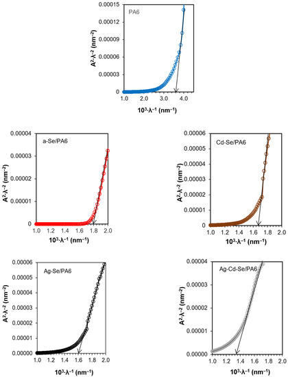 The experimental UV–Vis spectra correspond better to the rectilinear section on the graphs A2·λ−2 = (λ−1) (Figure 8), which confirm the direct transitions of the obtained nanocomposites.