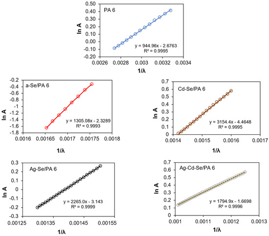 One of the sources of unfavourable recombination is the sub-band absorption tail, which was characterized by the Urbach energy. Absorption tails are defined as densities of states that extend from the bands into the band gap of the photoactive layer. Tail states inside the band gap act as traps and recombination centres and trap charge carriers. The EU is influenced by thermal and structural disturbances in semiconductor materials [86,87,88]. In this work, we analysed structure-dependent EU. The Urbach energy plots were constructed and are shown in Figure 9, and the calculated values are given in Table 5. EU reflects the density of states in the band tails and, hence, the local microstructural disorder [89]. As can be seen from the values presented in Table 5, the EU of PA 6 is 1.31 eV and is higher than those of the obtained nanocomposites. The relatively high value of EU indicates a greater tendency for the transformation of weak structural bonds into defects [90]. The a-Se/PA 6 nanocomposite (amorphous phase) is more structurally disordered. With the stepwise incorporation of Cd2+ and Ag+ ions, EU decreased. That may be due to an increase in the structural ordering of nanocomposites, which has been confirmed by an increase in crystallinity detected via XRD analysis. In addition, it was previously reported [91] that thicker selenide films have less structural randomness, since with an increase in the thickness and density of the layers, structural defects are minimized and subsequently the EU is also minimized.