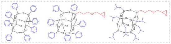 Octaphenyl-POSS (left), glycidyloxypropyl-heptaphenyl-POSS (middle), and glycidyloxypropyl-heptaisobutyl-POSS (right). (With permission from Ref. [55]; License number: 5617501151054, 2023, Elsevier).