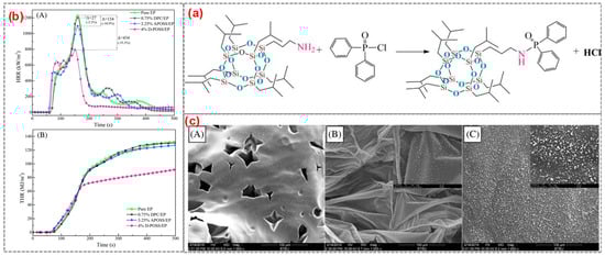 (a) The synthesis of D-POSS; (b) HRR curve (A) and THR curve (B); and (c) the SEM images of residues: (A) Pure EP; (B) 4%D-POSS/EP external; and (C) 4% DPOSS/EP internal. (With permission from Ref. [60]; License number: 5617510624430, 2023, John Wiley and Sons).