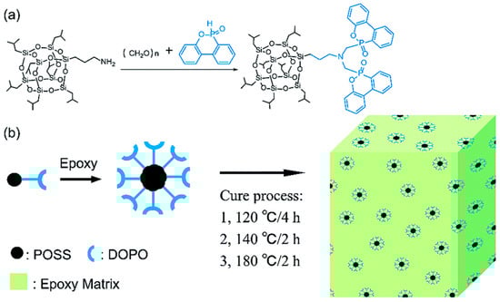 (a) The synthesis of POSS-bisDOPO and (b) preparation of POSS-bisDOPO-modified epoxy resin. (With permission from Ref. [61]; License number: 1390727-1, 2023, Royal Society of Chemistry).