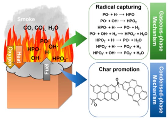 Flame-retardant mechanism of phosphorus-containing flame retardants: radical capturing effect in gas phase and char promotion effect in condensed phase. (With permission from Ref. [66]; License number: 5617540136833, 2023, Elsevier).