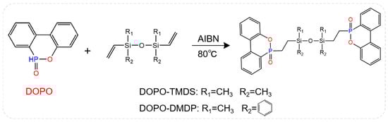 As mentioned above, the multi-element synergistic flame retardant formed by P and Si elements has an excellent flame-retardant effect. Figure 8 shows the structural formulas of two flame retardants (DOPO-TMDS and DOPO-DMDP) containing phosphorus phenanthene/siloxane groups, which are applied to the EP system [72]. When DOPO-TMDS content was 20 wt%, the LOI of flame-retardant epoxy resin was as high as 33% and passed the vertical burning test V-0 rating, and PHRR and THR were greatly reduced. In contrast, 24 wt% DOPO-DMDP was required to achieve a LOI value of 32% and obtain UL94 V-0 grade. In addition, although the addition of DOPO-TMDS and DOPO-DMDP enhanced the mechanical strength of the EP, a decrease in Tg was observed due to the presence of the siloxane structure.