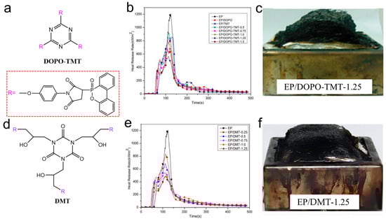 Huo et al. [73,74] designed two kinds of highly efficient flame-retardant additives, DOPO-TMT and DMT, containing DOPO and maleimide groups for EP systems (Figure 9a,d). In DOPO-TMT, phosphenanthrene and triazine were flame-retardant groups, and in DMT, phosphenanthrene and triazine-trione were flame-retardant groups. When the phosphorus concentration was only 1.25 wt%, the EP/DOPO-TMT-1.25 system passed UL94 V-0 grade with a LOI of 37.5%. The PHRR and THR values of EP/DOPO-TMT and EP/DMT samples gradually decreased with the increase in phosphorus content. Compared with EP, the PHRR of EP/DOPO-TMT-1.25 was reduced by 54%, while that of EP/DMT-1.25 was reduced by 59%, which shows a higher flame retardancy. DOPO acted with nitrogen-containing groups simultaneously in the gas and condensed phase. In the condensed phase, both DOPO and nitrogen-containing groups contributed to the formation of expanded and dense carbon residue, which acts as a fire barrier (Figure 9c,f). In the gas phase, DOPO groups produced free radical inhibitors to quench reactive free radicals, and the nitrogen-containing groups released inert gas to dilute the combustible gas by pyrolysis. This work provided strong evidence for the synergistic effect of phosphorus and nitrogen.