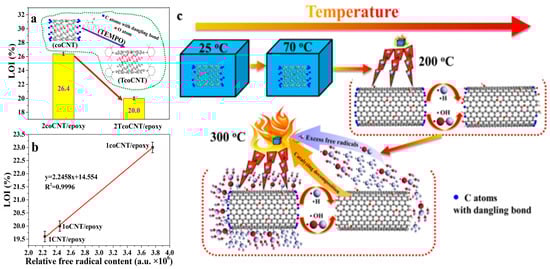 LOI performances of the 2coCNT/epoxy and 2TcoCNT/epoxy composites (a); relationship between the relative free radical content of the filler and the LOI performance of the composite (b); free radical scavenging effect of the coCNTs during thermal decomposition of composites (c) [86].