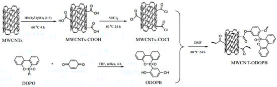 Moreover, functionalized grafting or inorganic filler loading of CNTs are also the modification approaches that have recently attracted much attention from researchers. It has been reported [87,88] that grafting functionalized siloxane (PDMA) onto CNTs can enhance the interfacial adhesion between CNTs and the polymer matrix, improve their dispersion in epoxy resins, and contribute to enhancing the flame-retardant properties of composites. Dopo-functionalized multiwalled carbon nanotubes (MWCNT) were obtained by grafting 10-(2,5-dihydroxyphenyl)-9,10-dihydro-9-oxygen-10-phospho-10-oxide (ODOPB) onto the outer surface of acylated multiwalled carbon nanotubes (MWCNT), as shown in Figure 11 [89]. MWCNT-ODOPB was co-introduced into the epoxy matrix with aluminum diethyl phosphate as a flame-retardant filler. When MWCNT-ODOPB content was only 1 wt%, the composite system achieved a LOI value of 39.5% and passed the UL94 V-0 grade. It is mainly due to the char formation of MWCNT-ODOPB and the synergistic effect of diethylaluminum phosphate. In a simpler method [90], phosphorus-nitrogen flame retardants were coated on CNTs and combined with epoxy resin to form composite materials. The synergistic effect of phosphorus-nitrogen flame retardants and nanomaterials endowed composites with excellent flame-retardant properties.