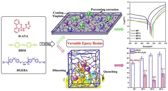 It has been reported that the introduction of bifunctional phosphate-containing triazole derivatives (D-ATA) into the epoxy resin system through curing reactions can simultaneously improve the flame retardancy and corrosion resistance of the resin (Figure 17) [120]. In this system, the structure of triazole phosphate not only contributes to flame retardation but also effectively inhibits electrochemical corrosion. When D-ATA content was only 5 wt%, the flame-retardant epoxy resin achieved an LOI value of 33.2%, passed the UL94 V-0 grade, and residual char yield reached 16.6%. Moreover, the anti-corrosion efficiency of EP/5 wt% D-ATA was increased by 95.3% compared with pure EP. At the same time, the mechanical properties of composite epoxy thermoset materials were also improved due to the existence of hydrogen bonds and π-π interaction in D-ATA.