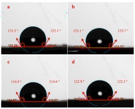 The WCA was calculated from both the left and right sides of the drop contour; values differing more than 2° were rejected.