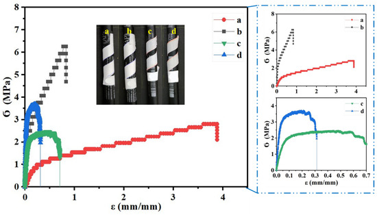 Tensile test profile of the different PCL electrospun membranes and cast films: (a) neat PCL electrospun membranes, (b) PCL/ZnO-NPs electrospun membranes, (c) neat PCL cast film, and (d) PCL/ZnO-NPs cast film. The photograph inside with yellow letters illustrates the flexibility of the membrane and film.