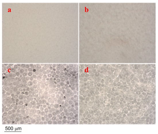 Optical microscopy images of the different PCL electrospun membranes and cast films: (a) neat PCL electrospun membranes, (b) PCL/ZnO-NPs electrospun membranes, (c) neat PCL cast film, and (d) PCL/ZnO-NPs cast film.