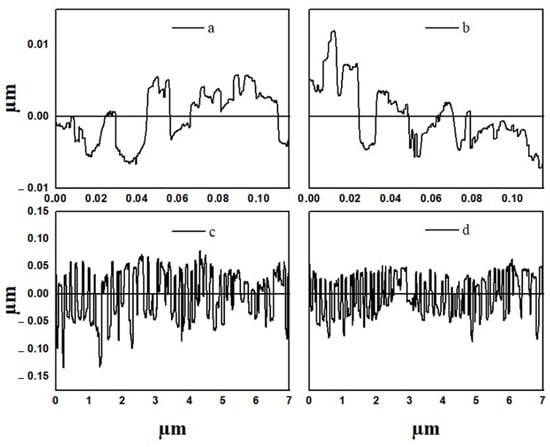 Surface profiles of the different PCL electrospun membranes and cast films from selected zones in Figure 5: (a) neat PCL electrospun membranes, (b) PCL/ZnO-NPs electrospun membranes, (c) neat PCL cast film, and (d) PCL/ZnO-NPs cast film.