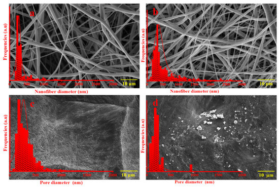 An illustration of the morphologies of neat electrospun, cast PCL and their composite membranes and films (PCL/ZnO-NPs) is shown in Figure 7, along with the diameter distributions of the electrospun nanofibers and film pores (summarized in Table 3).