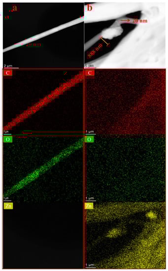 Furthermore, EDX mappings of the elemental components (Zn, O, and C) were included to confirm the excellent dispersion of ZnO-NPs within the fibers (Figure 8a,b). Accordingly, a uniform distribution of ZnO-NPs was observed, although some aggregation can be observed. As the ZnO-NPs were synthesized using green methods, the aggregation is largely caused by interactions between phytochemical compounds on the ZnO-NP surface and the polymer chains [93,94]. Nanoparticles’ aggregation may also be affected by the nature of the solvent; therefore, there may be a variation in the rate at which solvents and non-solvents are interchanged [97]. Regarding this, enhancing the surface roughness of polymer surfaces is essential, since it affects macromolecule adsorption and membrane formation to some extent [98]. The surface roughness measurements were further calculated and are discussed in the next section.