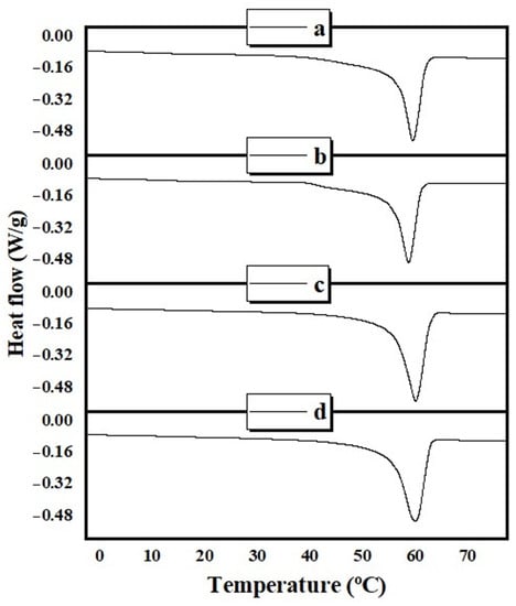 Thermograms were measured using a differential scanning calorimeter (Q-20, TA Instruments, New Castle, DE, USA) under nitrogen flow (50 mL/min) in the −70–120 °C range at 10 °C/min. Samples were previously dried in a desiccator for 48 h. The crystallization percentage or crystallinity degree of the polymer is calculated from the melting enthalpy , based on the melting or fusion heat according to Equation (4) [60].