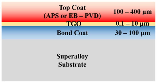 With increasing demands for energy savings and pollution reductions in many nations, the thermal conversion efficiency of gas turbines and aero engines must also rise. The most straightforward and effective way to enhance efficiency is to raise the inlet temperature of gas turbines and aero engines [1]. However, increasing the inlet temperature causes gas turbine and aero engine blades to experience excessive thermal stress, causing the hot-end components to fail due to reaching the weakening point for basic mechanical characteristics in a high-temperature environment, which is fatal to gas turbines and aero engines. At the moment, the most generally utilized solutions to overcome the aforementioned challenges are substrate-material performance-enhancement technology, air-cooling technology, and thermal-barrier-coating technology [2,3,4]. The maximum inlet temperature of gas turbines and aero engines has surpassed 1600 °C, but the limit temperature that the upgraded nickel-based superalloy can tolerate is only around 1150 °C, posing new problems for the safe operation of gas turbines and aero engines [5]. The foregoing results illustrate that just improving the material characteristics is no longer sufficient to fulfill the demands of most gas turbine and aero engine applications. To that goal, researchers from several nations optimized the engine structural. A cold air layer with a low temperature is generated by placing tiny holes or slots on the surface of the hot-end components, resulting in heat insulation and cooling [6]. The most modern air-cooling technology can now only boost the working temperature of gas turbines or aero engines by around 400 °C, which is insufficient to fulfill the demands of most engines. Furthermore, the process of air-cooling technology is complicated, and the extra energy required to drive the air flow would raise the strain on the engine, reducing the engine efficiency [7]. Based on this, the United States pioneered the application of thermal-barrier-coating technology to deal with this technological difficulty in the 1950s and 1960s in order to obtain improved thermal efficiency. The application of thermal barrier coatings not only raises the engine’s working temperature but also preserves the substrate material, improving engine efficiency while increasing service life [8]. The application of thermal barrier coatings allows engine hot-end components to combine the advantages of a metal substrate’s high strength and toughness with the high-temperature resistance of a ceramic layer. Moreover, the thermal barrier coating not only lowers the temperature of the metal substrate but also enhances its thermal stress qualities.