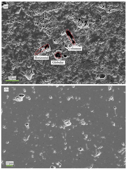 The interior microstructure of the coatings created by APS spraying had three basic morphologies, as shown in Figure 3a: globular, columnar, and horizontal strip. The porosity of these three features is classified based on their lengths in the horizontal and vertical directions. The porosity is set as globular when the lengths in the horizontal and vertical directions are close to each other as well as the length of the porosity in the horizontal direction is greater than the length in the vertical direction as horizontal strip, and vice versa as columnar. The uneven microstructure within the coating was reduced to pores for future modeling and solving. While globular pores were almost isotropic, columnar and horizontal strip pores were anisotropic. Therefore, these three structures were analyzed in the subsequent numerical simulations. In addition, Figure 3a,b demonstrate the thermal barrier coatings obtained by spraying with powder feedstocks of varying particle sizes. Figure 3a,b clearly show that the finer the powder initial particle size is, the lower the porosity is under the same process conditions. The finer the particle size of the powder is, the greater the possibility is of full fusion during the spraying process, and the greater the likelihood of fusion with other particles. At the same time, the pores of tiny-particle-size powders in unmelted contact with each other were smaller than those of coarse particle size powders. As a result, the pore structure might be modified based on the powder raw material and spraying process parameters to fulfill the goal of boosting service temperature and extending life.