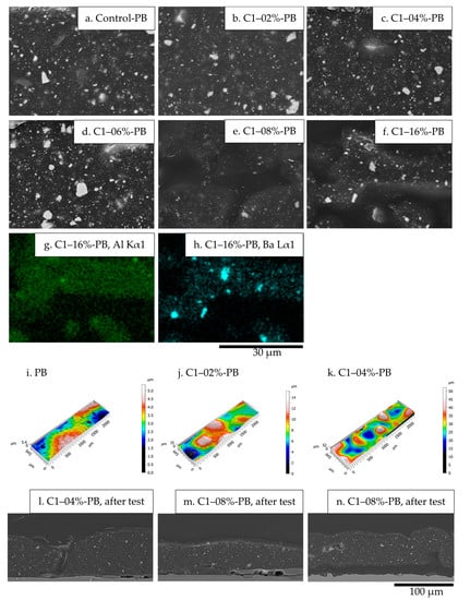 (a–f) SEM images, cross-sections of coatings with C1 dosages of 0–16%; (g,h) EDS maps of Al and Ba, coating with C1 16%; (i–k) confocal maps of coatings with C1. The Sa, for PB, C1–02%-PB, C1–04%-PB is 0.6 µm, 1.8 µm and 5.6 µm, respectively; (l–n) coatings with delaminated areas after immersion test, C1 4% and 8%.