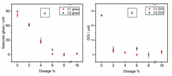 The surface quality of the coatings was studied based on their specular gloss [26] and distinctness-of-image (DOI) [27]. Figure 3 illustrates that both gloss and DOI declined with nanoclay dosage. Notably, the coatings containing nanoclay C2 displayed slightly higher surface quality than those with nanoclay C1, aligning with the observations from the confocal mapping, indicating a less severe impact on surface roughness for coatings with C2.