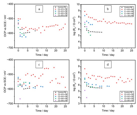 OCP and Rp values for coatings with 0–16% C1 (a,b), and C2 (c,d).