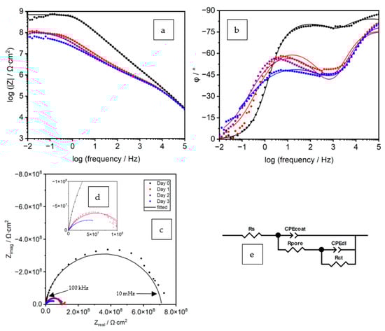 (a–d) Representative EIS spectra of the coated panel (C1–02%-PB) from day 0 to day 3, (e) the EEC used for fitting.