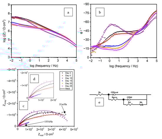 (a–d) Representative EIS spectra of coated panel C1–02%-PB, from day 4 to day 25, (e) the EEC used for fitting.