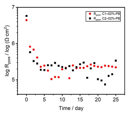 Figure 7 presents the fitted values of pore resistance (Rpore) for the two coatings C1–02%-PB, and C2–02%-PB. Comparative analysis reveals that the larger nanoclay provided a higher level of barrier enhancement. This can be attributed to the larger contact area of the coarser particles with the binder matrices. Additionally, the finer particles resulted in significantly more entrapped air packets on their surfaces, leading to aggravated electrolyte ingress [7]. Consequently, the coating with 4% nanoclay C1 exhibited the highest performance, as evidenced by its highest Rpore, aligning with the results from the OCP and Rp measurements.