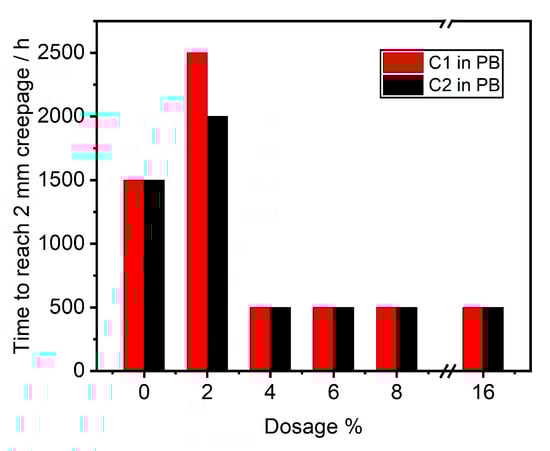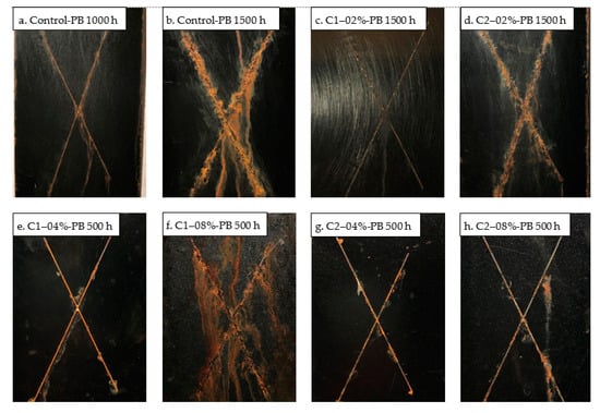 The neutral salt spray test, conducted as per ASTM B117 [35] and D1654-08 (Reapproved 2016) [36], was performed on the coated panels with 0.5 mm scribes. Figure 8 presents the hours required for each coating to exceed a mean creepage (Wc) of 2 mm. 3 replicates were tested for each formulation, and the time for one of the three to reach the creepage (the shortest time for one of three) was recorded as the test result. The panel images taken at the conclusion of the test are displayed in Figure 9.