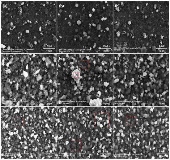 SEM images of hydroxyapatite coatings deposited at 1064 nm (a–c), 532 nm (d–f), and 355 nm (g–i) laser wavelengths at three different substrate temperatures: room temperature, 500 °C, and 800 °C. The red squares indicate the areas for which EDS analysis was performed.