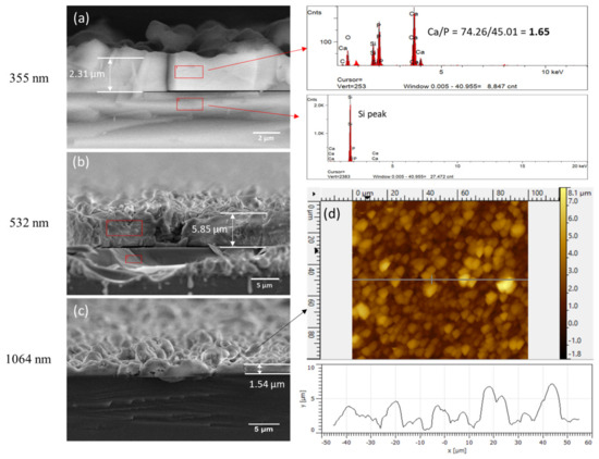 Figure 3 shows the cross-sectional view of SEM images of the deposited HA coatings at different wavelengths, along with the AFM line scan. From the cross-sectional view, one can observe that at 800 °C, the HA coating’s microstructure is fragile. This effect had consequences that can be seen in protein adsorption, cell growth, and adherence strength tests. At this interface, the EDS results also suggested a lower Ca/P ratio, showing that the stoichiometry was not completely maintained, indicating some signs of degradation.