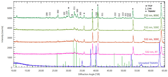 X-ray diffractograms of hydroxyapatite coatings synthesized onto Ti6Al4V substrates using a 532 nm beam. Referenced to JCPDS 09-0432.