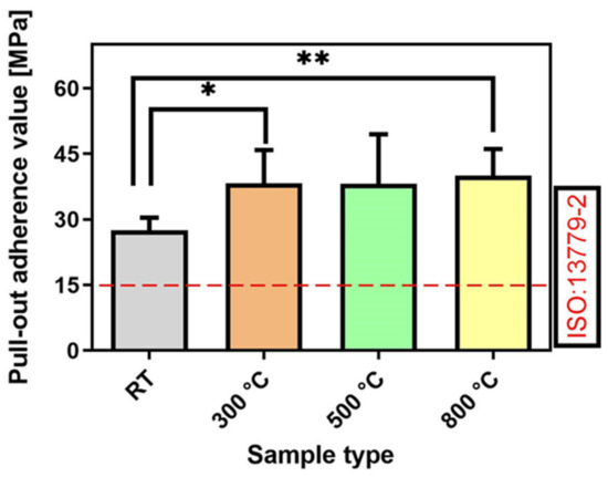 Mean bonding strength adherence values obtained in the case of hydroxyapatite coatings synthesized by pulsed laser deposition onto titanium substrates at RT, 300 °C, 500 °C, and 800 °C. Note: * p < 0.05, and ** p < 0.01, Student’s t-test.