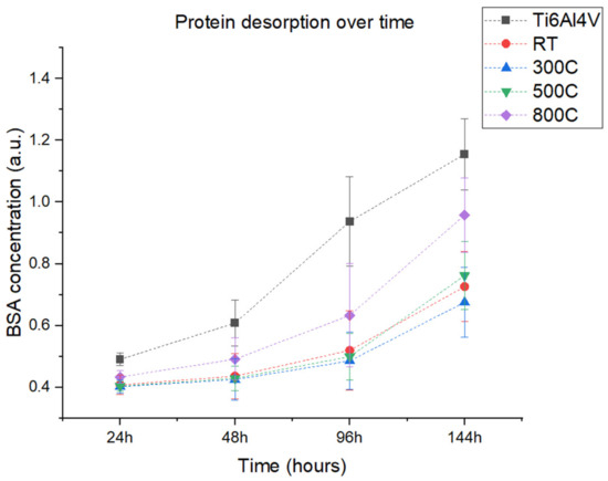 Protein desorption over time on the Ti6Al4V surface and hydroxyapatite coatings deposited at room temperature, 300 °C, 500 °C, and 800 °C.