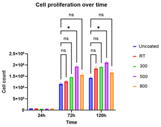 Proliferation of HEK293T cells on the Ti6Al4V substrate and hydroxyapatite coatings deposited at different temperatures with statistically significant (*) and no significance (ns).