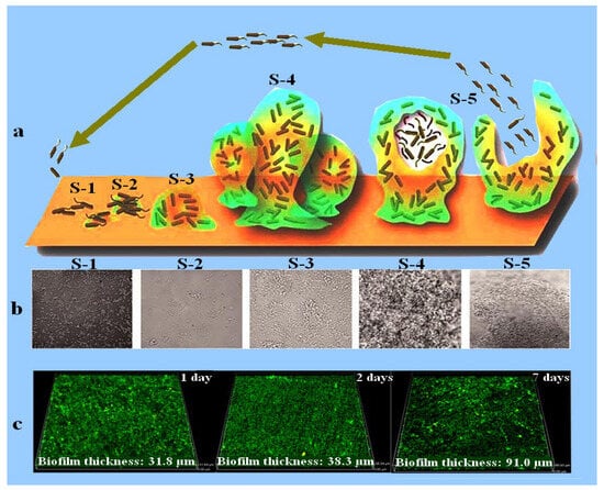 Schematic diagram displaying biofilm development (a) [11]. (b) SEM micrographs of biofilm development with increasing immersion time, where S-1 represents the bacterial cells attachment, S-2 represents the establishment of bacterial cells in the form of a colony and EPS secretion, S-3 denotes the early stage of biofilm formation, S-4 characterizes the fully grown biofilm, and S-5 is the final stage of the biofilm where bacterial cells leave the biofilm and are mature enough to attach to a new surface. Reprinted with permission from ref. [11]. Copyright 2023 Frontiers in Chemistry. (c) CLSM images showing the biofilm thickness measured after 1, 2, and 7 days of immersion in a medium inoculated with marine bacteria Marinobacter aquaeolei. Reprinted with permission from ref. [12]. Copyright 2023 Springer Nature.