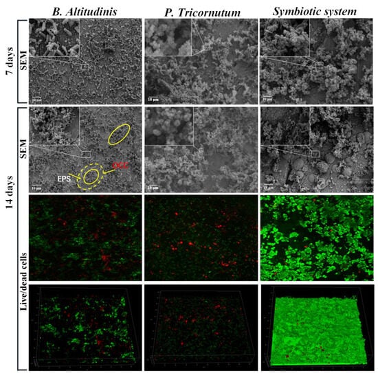Microalgae have been found to secrete EPS, which further triggers the corrosion process by complexation with metals [68]. Multispecies biofilms, as shown in Figure 4, are able to form stable micro-consortia that strengthen the three-dimensional structure of the adhesive layer and accelerate biofouling. Owing to the combined effect of the symbiotic system, the anodic part underneath the biofilms, which lacks oxygen and is abundant in EPS, would continue dissolving. This further enhances the oxygen concentration cell (OCC) corrosion of the metal, leading to an increased accumulation of corrosion products on the material surface [80].