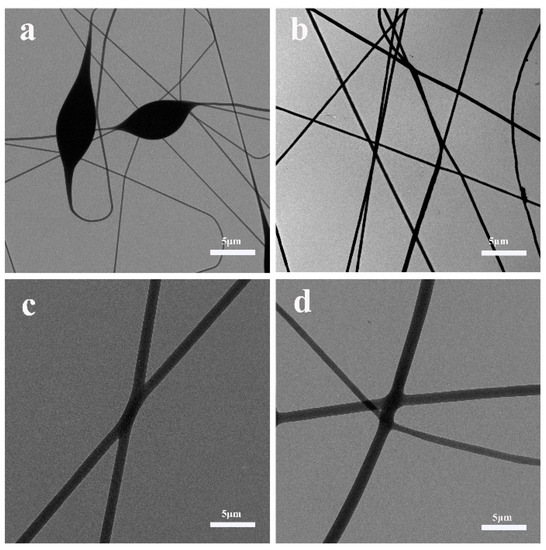 The surface topography and energy dispersive spectrometer (EDS) of fibers were examined by scanning electron microscopy (SEM). The images were acquired with an SEM-S-4800Ⅱ (JOEL, Tokyo, Japan). Before using an accelerating voltage of 15 kV, the samples needed to be coated with a platinum nanolayer. Transmission electron microscopy (TEM) images were collected using a JEM-HT770 (JOEL, Tokyo, Japan) field emission electron microscope at a 200 kV accelerating voltage. In order to analyse, the specimens were deposited on a copper grid coated with a porous carbon film. The phase of all fibers was determined by an X-ray diffractometer (D/max-2500/PC, Nippon Rigaku Corporation, Tokyo, Japan) at a scan rate of 5° min−1, ranging from 5° to 35°. For further verifying the structure of fibers, Fourier infrared spectroscopy (FTIR, Nicolet iS10, Thermo Scientific, Waltham, MA, USA) were used to collect this information. The hydrophilicities of samples were observed by the water contact angle, which required the help of an optical contact angle tester.