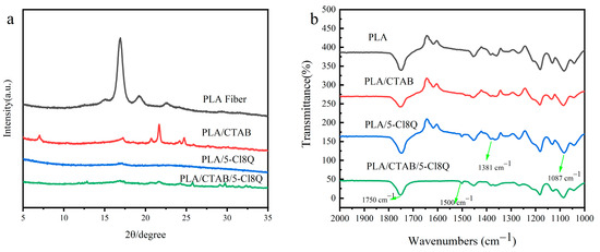 The crystallographic structures of the products were analyzed using X-ray powder diffraction (XRD) (Figure 3a). The XRD pattern of PLA Fiber exhibited a prominent sharp diffraction peak at 15.82°, corresponding to the (110/200) plane, as well as a low-intensity diffraction peak at 18.05°, corresponding to the (203/113) plane [26]. In the XRD pattern of PLA/CTAB, observed peaks at 2θ values of 6.60, 16.90, 21.60, and 24.80 matched the diffraction peaks of CTAB. Additionally, the peak corresponding to PLA became significantly weaker, suggesting that the inclusion of CTAB disrupted the crystalline structure of PLA. As PLA and 5-Cl8Q transitioned from crystalline to amorphous states during spinning formation in the precursor solution, the XRD pattern of the PLA/5-Cl8Q sample did not exhibit the diffraction peaks of PLA and 5-Cl8Q. In comparison, the XRD pattern of PLA/CTAB/5-Cl8Q showed a few weak absorption peaks, indicating a particularly poor crystallinity in the PLA/CTAB/5-Cl8Q sample.