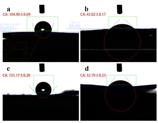 The hydrophilicity of the fibrous membrane plays a significant role in the release of its antibacterial agent. The water contact angle of the PLA fiber was found to be 104.899° (Figure 5a), indicating that it is hydrophilic. However, the presence of beaded structures in the spinning process also contributes to its hydrophobicity to some extent. In the case of PLA/CTAB, the water contact angle was measured as 43.019° (Figure 5b). This is because CTAB, a hydrophilic polymer, constitutes a large portion of PLA/CTAB, thus contributing to its good hydrophilicity.