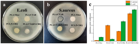 The PLA Fiber, PLA/CTAB, PLA/5-Cl8Q and PLA/CTAB/5-Cl8Q were subsequently assayed to assess their antimicrobial activity against S. aureus and E. coli. Both bacteria were stored under freezing conditions and artificially cultured on agar. Four fiber film discs with a diameter of 1 cm, sterilized by UV for 30 min, were placed in two agars cultured S. aures and E. coli for 24 h at 37 °C. The antibacterial effect of the four electrospinning films was shown by the width of the inhibition circle. The wider the width, the better the effect.