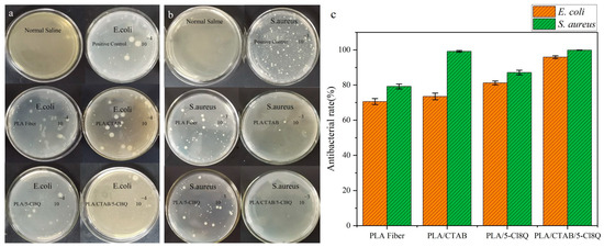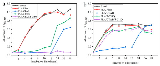 Figure 8a presents the antibacterial growth curve of each spun nanofiber against S. aureus. Compared to PLA Fiber, the other three spinning samples inhibited the reproduction of S. aureus. Analyzing the curve of PLA Fiber against S. aureus, it can be observed that the inhibition time is 4 h, and the inhibition effect is weak. During the initial two hours, the bacteriostatic effect of PLA/CTAB/5-Cl8Q is superior to that of PLA/CTAB and PLA/5-Cl8Q, which aligns with the results of the antibacterial rate experiments. For the fiber samples, the degree of bacterial inhibition varies with the growth cycle of the bacteria. After 12 h, the bacterial absorbance of PLA/CTAB and PLA/5-Cl8Q increases significantly, and the antimicrobial rates decrease. This can be attributed to the fact that bacteria multiply faster than the release of bacteriostatic agents. On the other hand, the absorbance of PLA/CTAB/5-Cl8Q remains consistently low, indicating that it exhibits the best antibacterial performance among these samples and maintains a stable antibacterial effect.