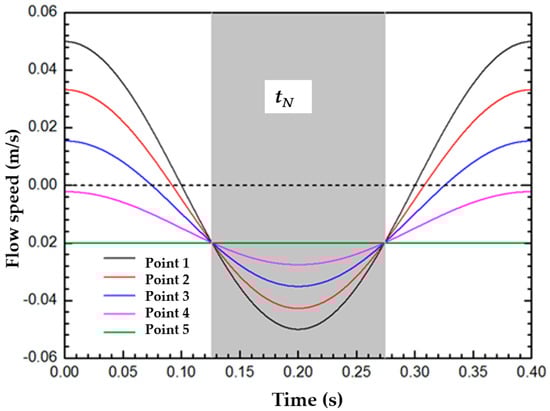 Different positions with the same spacing in the thickness direction of the liquid slag film were chosen, including five nodes, where Node 1 was the contact position between the protective slag and the mold, Node 2 was adjacent to node 1, Node 3 was adjacent to Node 2, Node 4 was adjacent to Node 3, and Node 5 was the contact position between the liquid slag and the initial solidification shell, the distance between each node was the same. The velocity variation pattern of each node in a vibration cycle was shown in Figure 2. Among them, the speed of Node 1 was equal to the vibration speed of the mold, and the speed of Node 5 was equal to the casting speed. A positive flow rate indicated that the protective slag flows upwards, meaning that the gap between the protective slag and the consumption of the protective slag was negative. On the contrary, a negative value indicated that the protective slag flowed downwards; that is, the protective slag flowed into the gap and the consumption was positive. The liquid protective slag near the solidification shell flowed downward from the crystallizer as the billet moved. The inflow/outflow state of liquid protective slag near the solid slag film layer was mainly affected by the up-and-down vibration of the mold. It was observed that during the period of positive detachment, the flow velocities of liquid slag at Nodes 2, 3, and 4 were positive for some time, but there were also negative values, indicating that there were cases of liquid slag both entering and exiting the gap during the period of positive detachment. During the negative slip period, due to the negative velocity, there was no gap for the flux to flow out, and the flux always flowed in and consumed downwards during this period. The calculation results in this article are consistent with those of Ramirez-Lopez et al. [20], Meng et al. [21], and Zhu et al. [22].