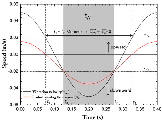 The flow velocity of different nodes within a vibration cycle along the thickness direction of the liquid slag was calculated, based on this, the average flow velocity of the protective slag was calculated, as shown in Figure 3. At t1, , the average flow velocity of protective slag on the cross section of the slag channel was 0, the amounts of protective slag flowing out and into the gap were equal, and the consumption of protective slag was 0. Afterwards, the inflow of protective slag was greater than the outflow, and the protective slag was carried out of the crystallizer with the solidification shell. At t2 = 0.126 s, the negative slip motion began, and under the combined action of the downward movement of the crystallizer and the negative pressure in the slag channel, the protective slag flowed into the gap. When t = t4, the inflow and outflow of protective slag reached a balance. When t > t4, the average flow velocity of the protective slag was positive; that is, the liquid slag flowed out of the gap upwards, and the slag consumption was negative. From this, it could be seen that within the time range t1~t4, at this point , the average flow rate of liquid slag was negative and would flow downwards into the gap between the mold and the shell. When the mold vibrated downwards at its maximum speed, the flow velocity reached its maximum value of 0.0351 m/s. When , the upward outflow of protective slag was higher than the inflow, and its contribution to slag consumption was negative. Therefore, in both positive and negative slip states, there was a positive consumption of protective slag. The consumption stage of protective slag existed from the end of positive slip to the early stage of the next positive slip state and included the entire negative slip time, which was consistent with previous research results [23,24].