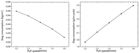 The variation of the consumption of protective slag with the casting speed was shown in Figure 4. As the casting speed increased, the consumption of protective slag per unit area decreased, but the decrease in protective slag was relatively small. It could be seen that when the casting speed increased from 1.2 m/min to 1.6 m/min, the consumption of protective slag per unit area only decreased by 4.76%, from 0.246 kg/m2 to 0.234 kg/m2. However, the consumption of protective slag per unit length of casting billet during a vibration cycle increased from 1.968 g/m·cycle to 2.499 g/m·cycle, an increase of approximately 26.98%. When the casting speed increased, the frictional resistance of the mold increased, making it more difficult for the protective slag to flow into the gap between the mold and the casting billet, and the thickness of the slag film became thinner. Therefore, the consumption of protective slag per unit area decreased. Many scholars have observed that when the mold is in sinusoidal or non-sinusoidal motion, the consumption of protective slag decreases with the increase in casting speed [25]. The findings of this article are consistent with previous research.