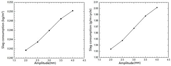 Based on the C group calculation example in Table 2, the relationship between the consumption of protective slag and the amplitude change is shown in Figure 5. The amplitude increased from 2 mm to 4 mm, and the consumption of protective slag per unit area increased by 3.52%. The consumption of protective slag per unit area increased slightly with the increase of amplitude. The consumption of protective slag per unit billet length increased from 1.934 g/m·cycle to 2.002 g/m·cycle. From the results, the slag consumption per unit area, periodic vibration slag consumption, and amplitude were basically linearly related. As the amplitude increased, the gap between the mold and the billet increased, leading to more protective slag flowing into the gap between the mold and the billet, resulting in an increase in the consumption of protective slag. The calculation results in this article are consistent with Meng et al. [21].