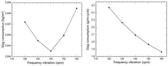 The effect of vibration frequency change on the consumption of protective slag is calculated, as shown in Figure 6. The vibration frequency changed from 120 cpm to 160 cpm, an increase of about 33.3%. The consumption of protective slag per unit area showed a trend of first decreasing and then increasing, while the consumption of protective slag per unit length of casting billet gradually decreased within a vibration cycle, decreasing by about 24.6%. As the vibration frequency increased, the amount of protective slag flowing between the mold and the billet per unit time decreased. Therefore, as the vibration frequency increased, the consumption of protective slag showed a decreasing trend. However, if the vibration frequency continued to increase, there may be an increase in the consumption of protective slag. The calculation results in this article are consistent with Meng et al. [21].