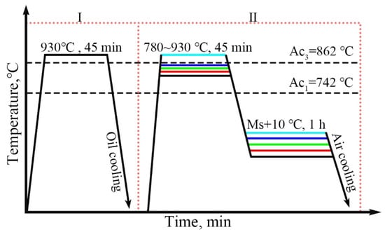 The author’s team designed a medium-carbon steel with the specific composition as follows: Fe-0.39C-1.25Mn-1.55Si-1.11Cr-0.34Mo (wt.%). The corresponding heat treatment process was developed, as shown in Figure 1. The sample was austenitized at 930 °C in Step I and directly oil quenched after holding for 30 min to obtain martensite. Step II: Heat up to 930 °C, 840 °C, 805 °C, 795 °C, and 780 °C for 45 min and then isothermal in a salt bath furnace at Ms+10 °C, respectively.
