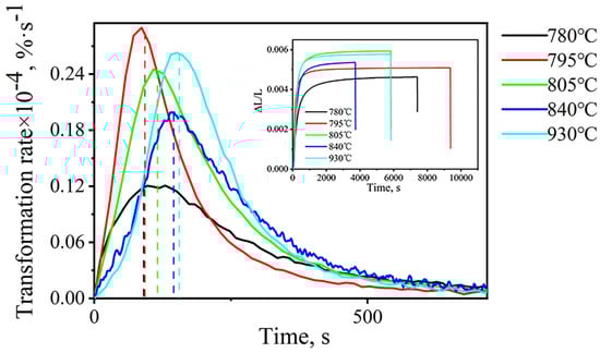 Figure 2 shows the bainite transformation rate curves, where the insets show the isothermal curves of the tested steel under different heat-treatment processes. For all heat-treatment processes, the bainitic transformation rate is close to 0 in the 2000s, and the incubation period is almost undetected. In addition, with the increase in isothermal time, the bainite transformation rate of the five processes first increases and reaches peak value, then decreases. Autocatalytic nucleation makes bainite have a high nucleation rate [15]. When the nucleation rate and growth rate match the best, the bainitic transformation rate reaches the peak value. After that, the original austenite grain is continuously divided by the formed bainite, increasing the probability of collision between bainite and bainite and reducing the growth rate and transformation rate. When bainite continues to grow and touches the austenite grain boundaries or collides with each other, bainitic transformation stops.