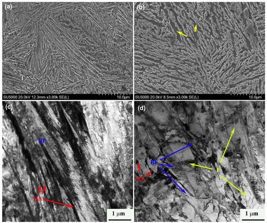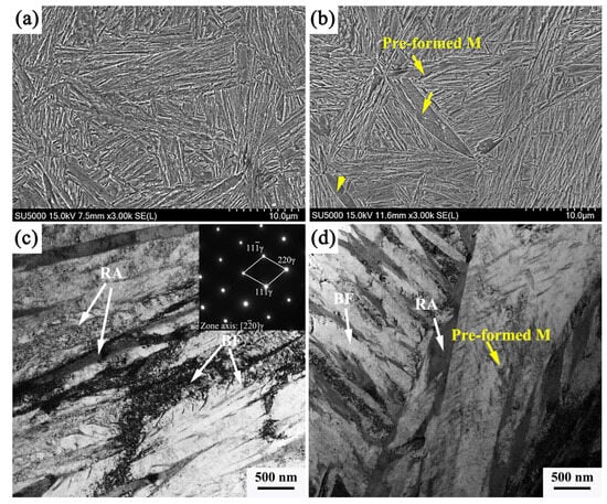 Figure 7 shows the SEM and TEM images of the two heat treatment processes; after the traditional one-stage bainitic transformation process, the microstructure consists of bainitic ferrite and retained austenite, and the width of the bainitic ferrite plate is more uniform, as shown in Figure 7a,c. Compared with the microstructure after the pre-formed martensite process, the wide and long plate in the microstructure can be clearly seen, which is more obvious under TEM observation. Nano-scale carbides distribute on the lath, and this morphology is a typical pre-formed martensite. This part of the pre-formed martensite undergoes self-tempering during the second-stage isothermal process, and thus, precipitation of carbides occurs. It is also observed that the size of the bainitic ferrite plate obtained in this process is thin in the width direction.