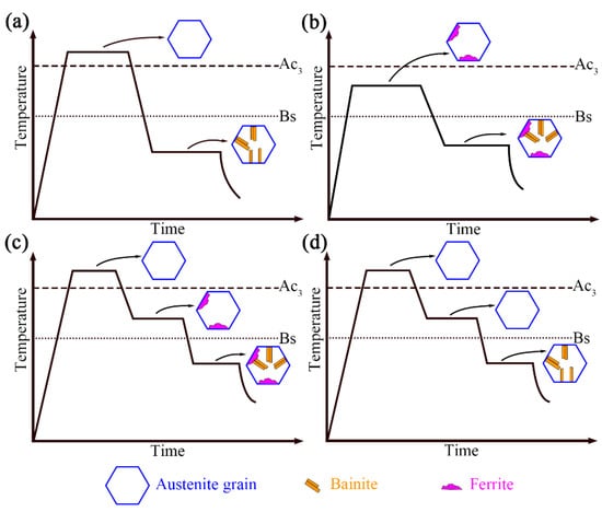 A schematic diagram of the effect of pre-formed ferrite on bainite transformation in this study and present research is shown in Figure 4. Adding an intermediate heat treatment process between austenitizing and bainite isothermal can also be conducive to bainitic transformation, as shown in Figure 4c. Research indicates that after complete austenitizing, adding intermediate heat treatment steps (holding below Ac3 temperature) will form ferrite at the austenite grain boundary [16]. This step accelerates the bainitic formation kinetics, which is mainly due to an increase in the density of the bainitic nucleation sites. Bainitic ferrite can nucleate at the initial nucleation point of the austenite/austenite interface and can also form at the secondary nucleation point at the austenite/ferrite interface [17]. The ferrite growth before bainitic transformation directly affects the available interface density for bainitic formation. The growth of ferrite leads to the formation of a ferrite/austenite interface, which means that additional interfaces are generated in the original austenite grains, and the total density of the available interfaces for bainite nucleation increases. In addition, even if no ferrite formed during the two-phase region, there is still an acceleration effect, which is related to carbon atom segregation, as shown in Figure 4d [18].